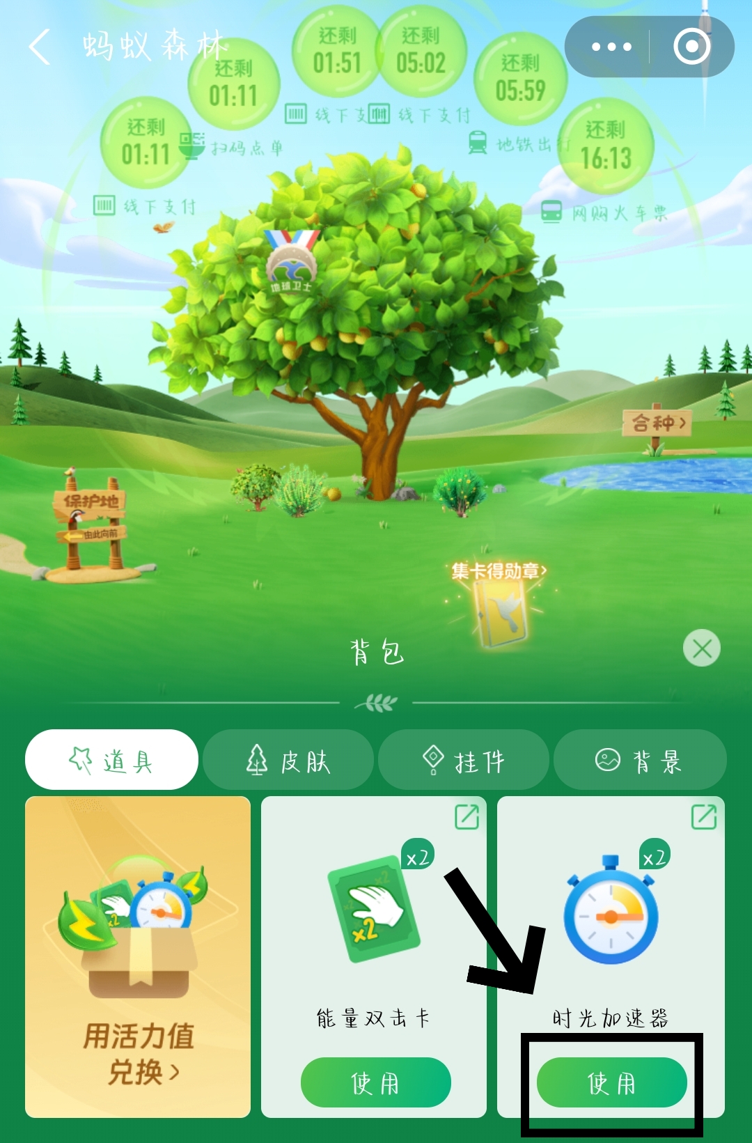 2、在【背包】中我们就可以看到时光加速器了,点击【使用】。