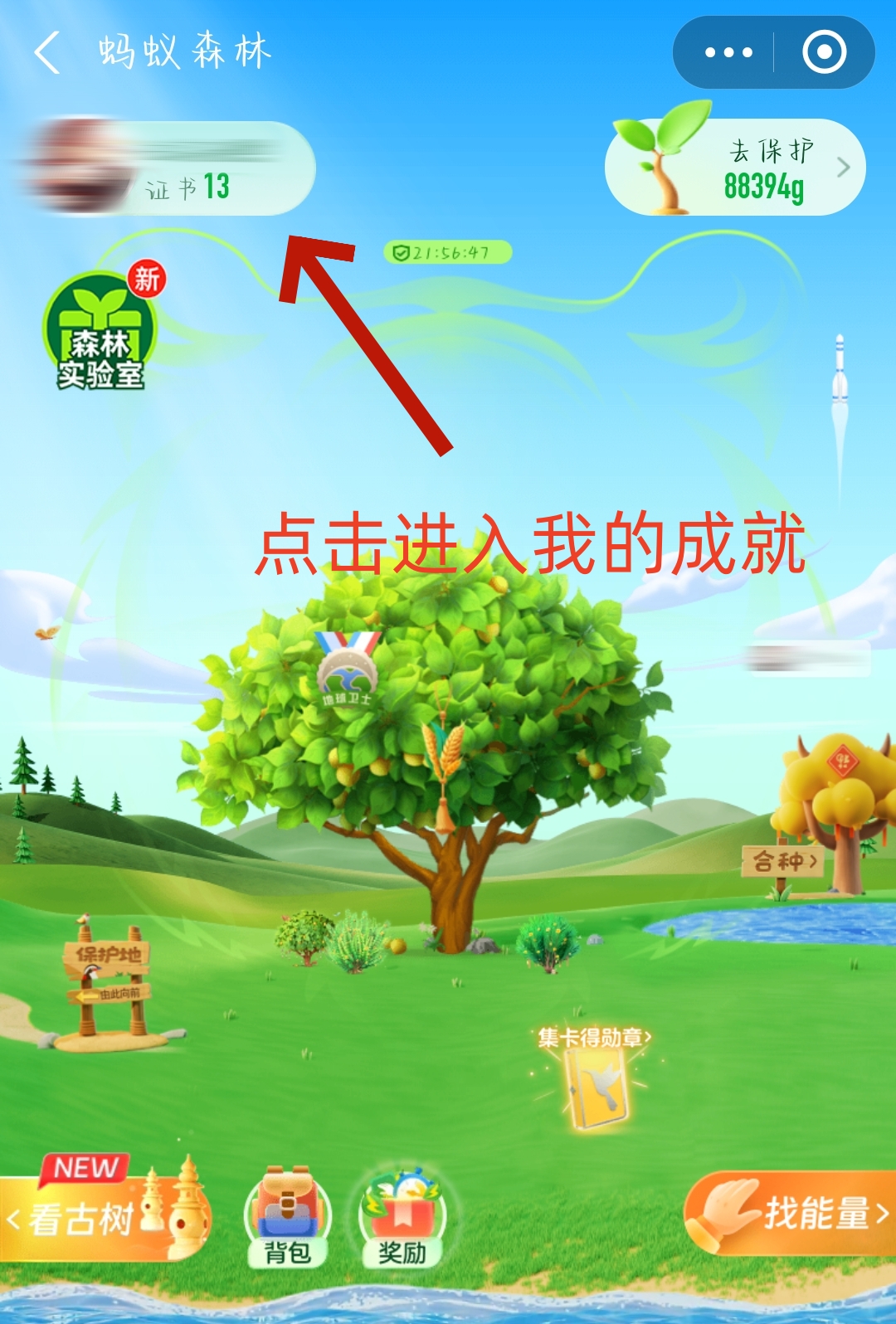 2、进入【蚂蚁森林】后,我们点击左上角的【我的成就】。