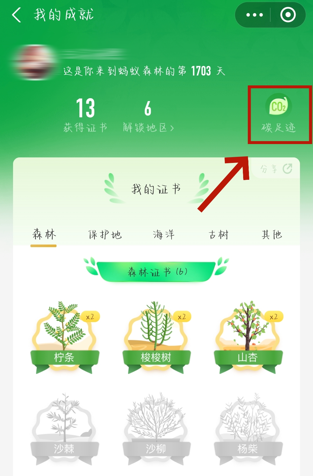 3、进入【我的成就】页面后,【碳足迹】就在右上方喔,直接点击!