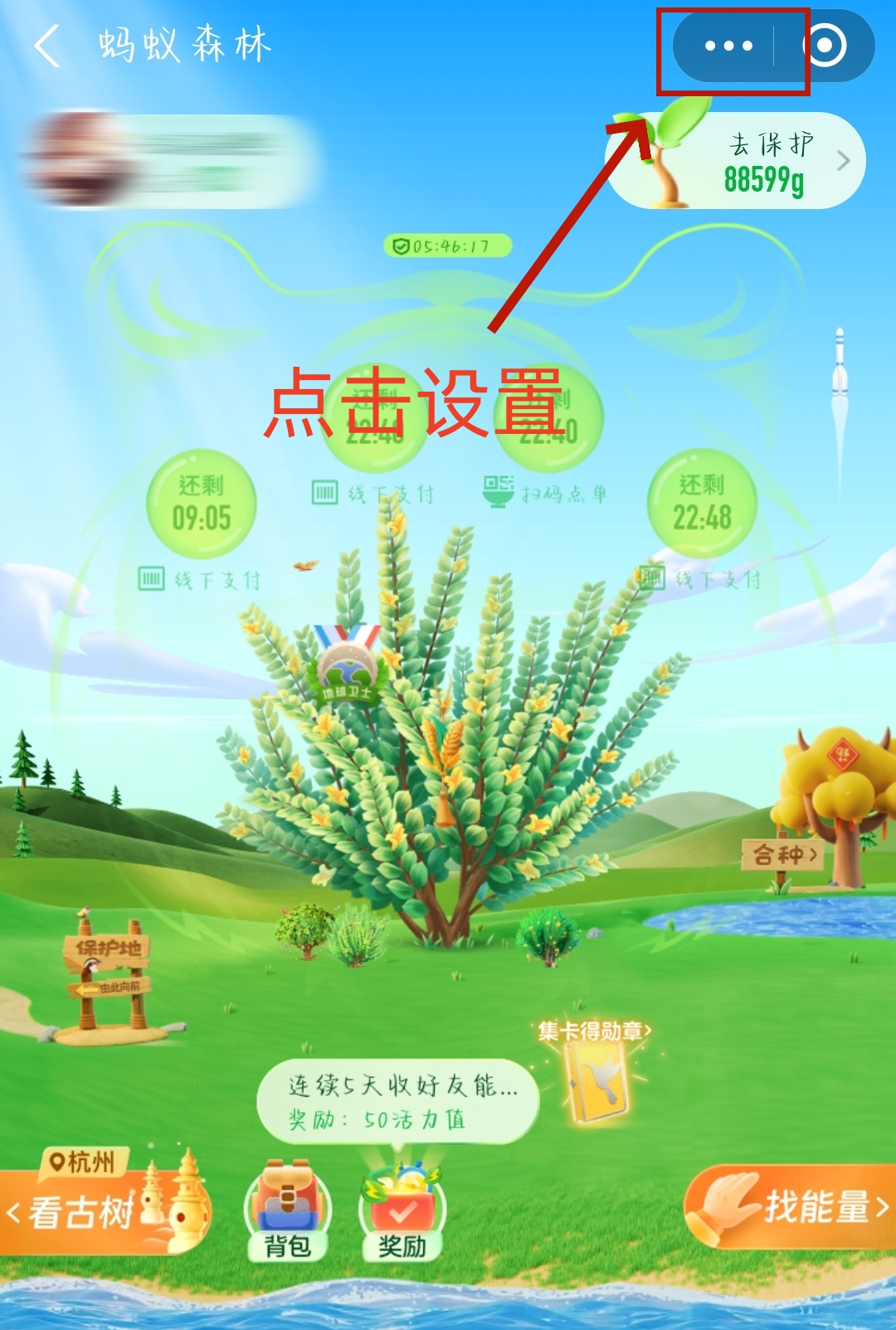 1、首先,我们来到蚂蚁森林的首页,再点击右上角的【···】。