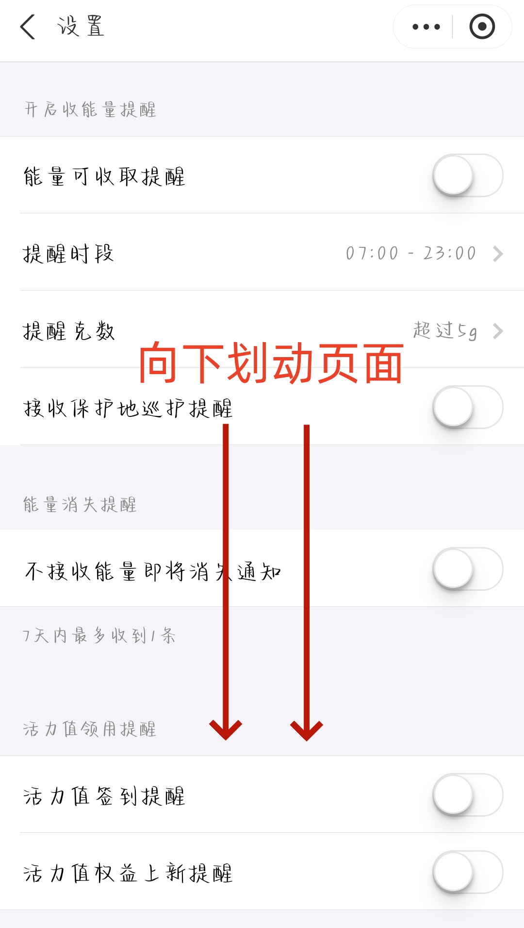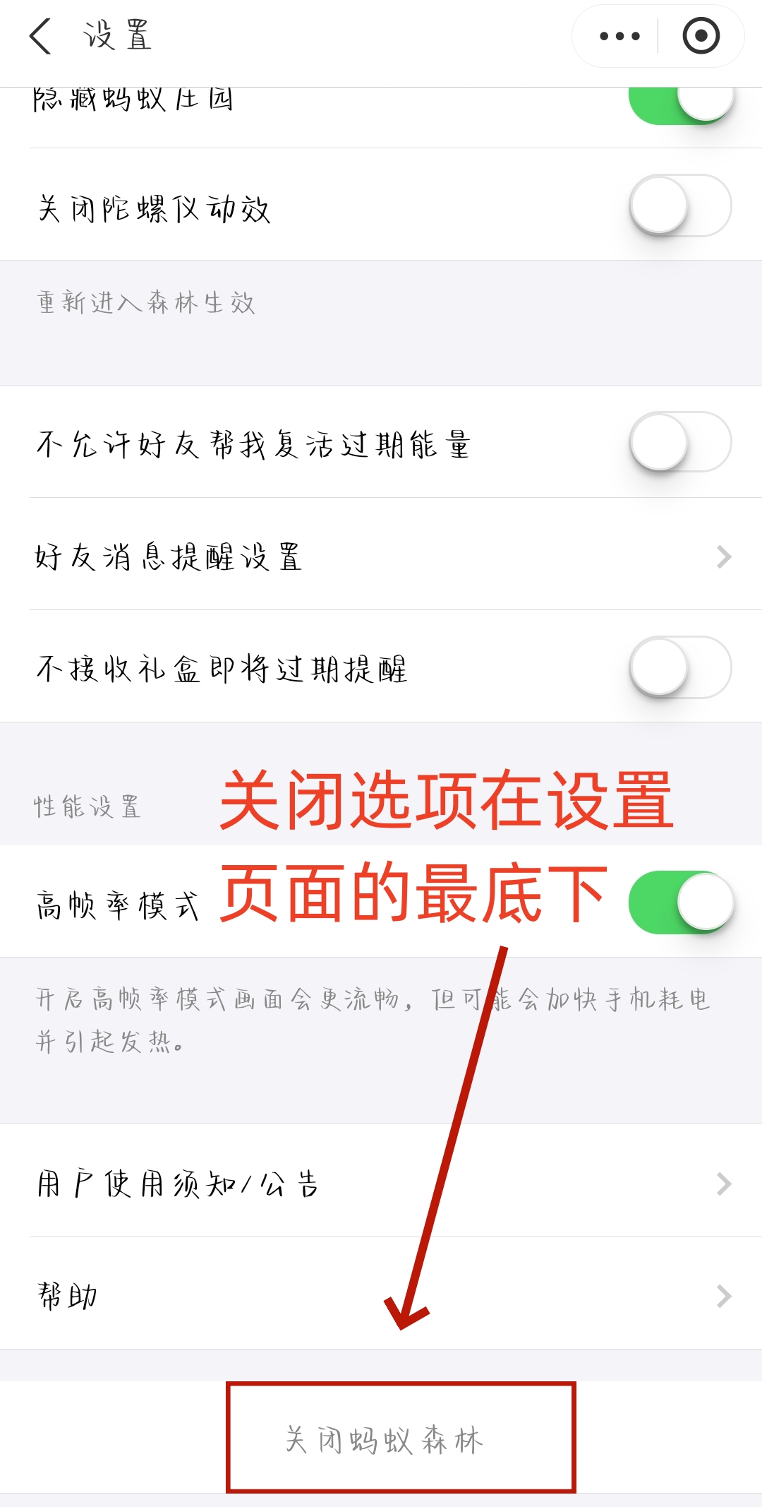 2、【···】就是蚂蚁森林的【设置】页面,进入页面后,我们就可以找【关闭】的选项了,大家一直往下划。