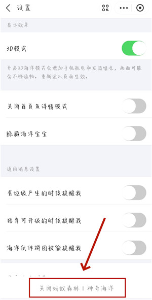 4、进入【设置】页面后我们就能看见底下的【关闭蚂蚁森林 | 神器海洋】了,直接点击就可以啦!