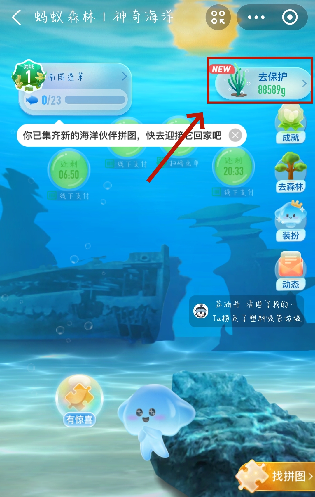 2、点击【海域】后我们就进入神器海洋的页面了,再点击右上方的【去保护】。