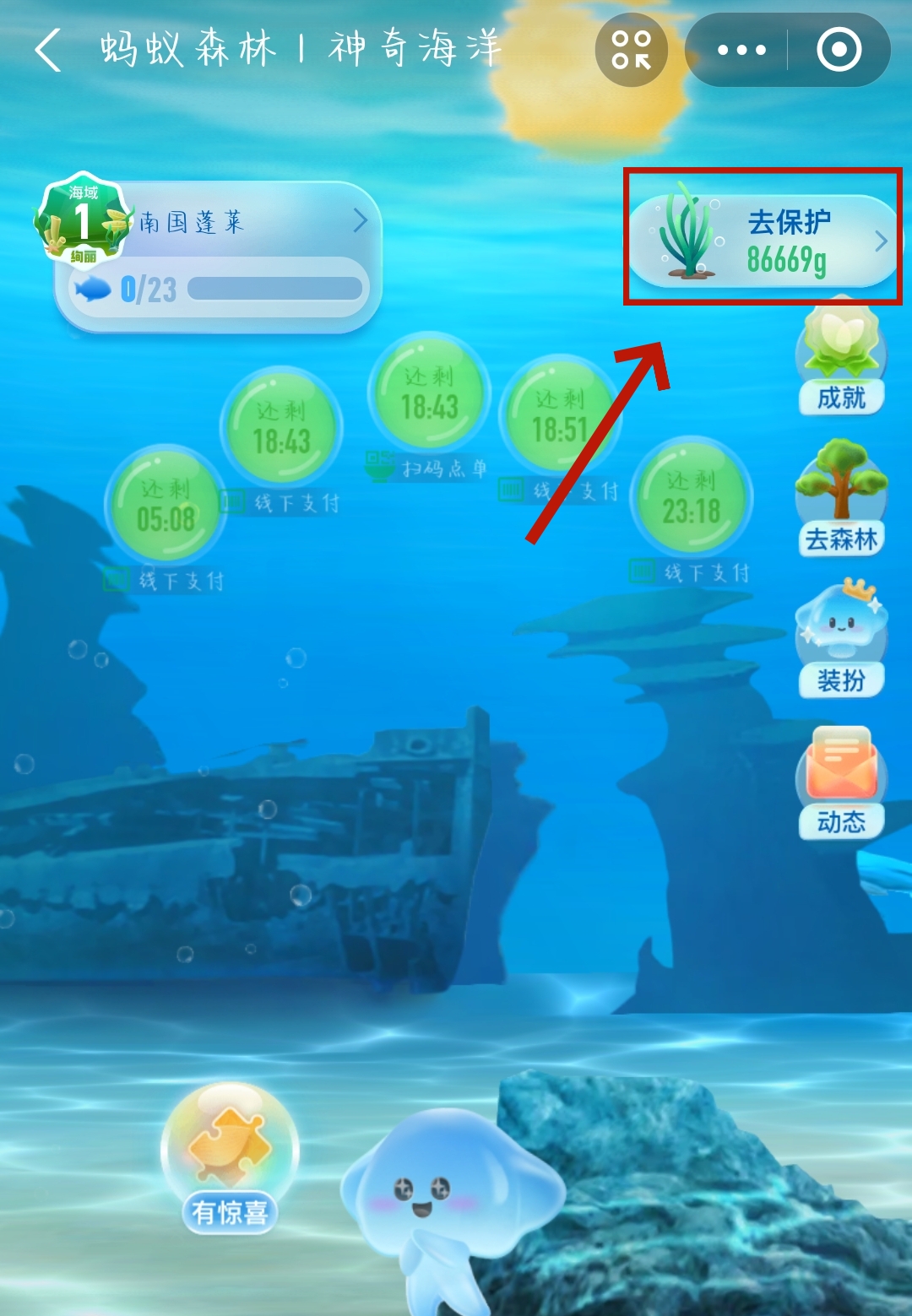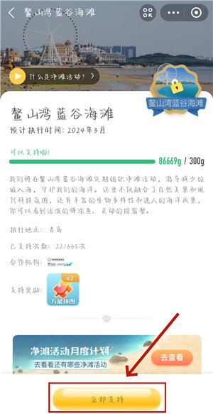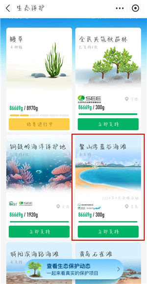 2、进入【生态保护】后,我们就可以选择想要支持的保护地了,这里小编以【鳌山湾蓝谷海滩】为例。