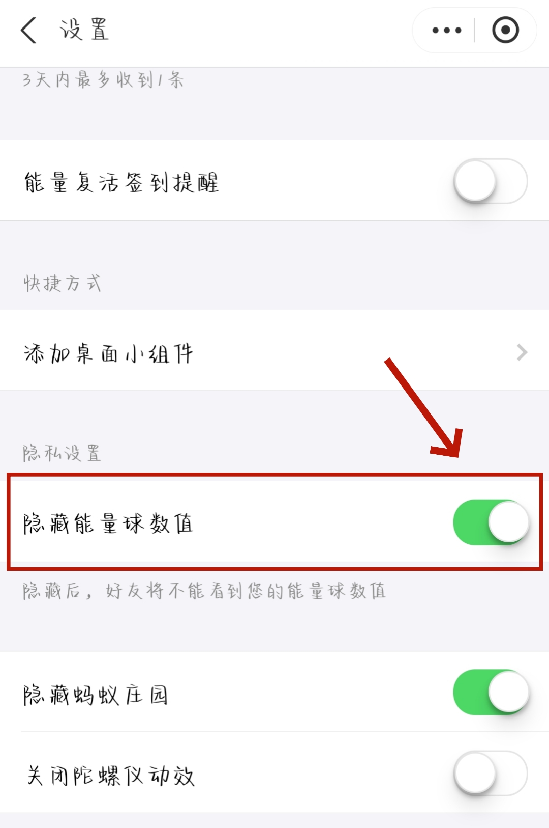 3、进入【设置】页面后,我们下划到【隐私设置-隐藏能量球数值】,直接打开开关就可以隐藏能量球数值啦!
