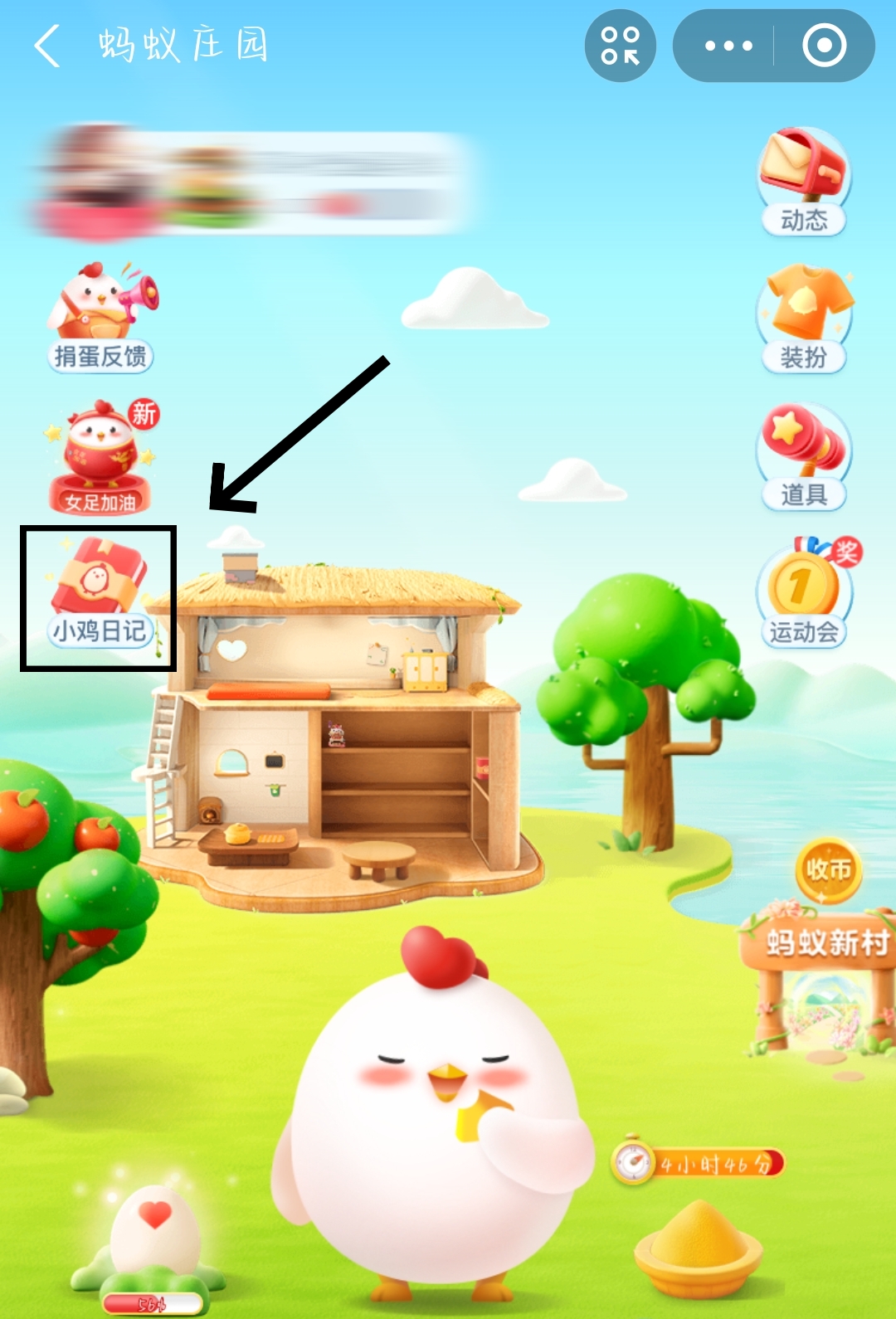 1、首先我们来到蚂蚁庄园的首页,点击左边的【小鸡日记】。