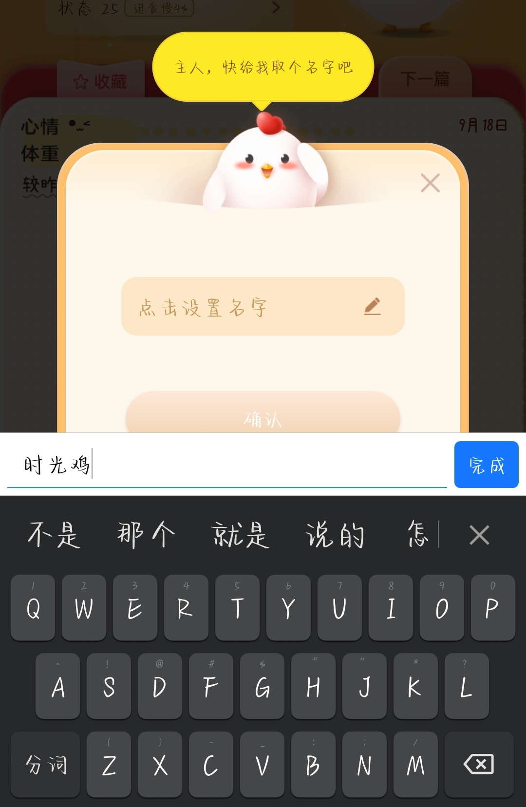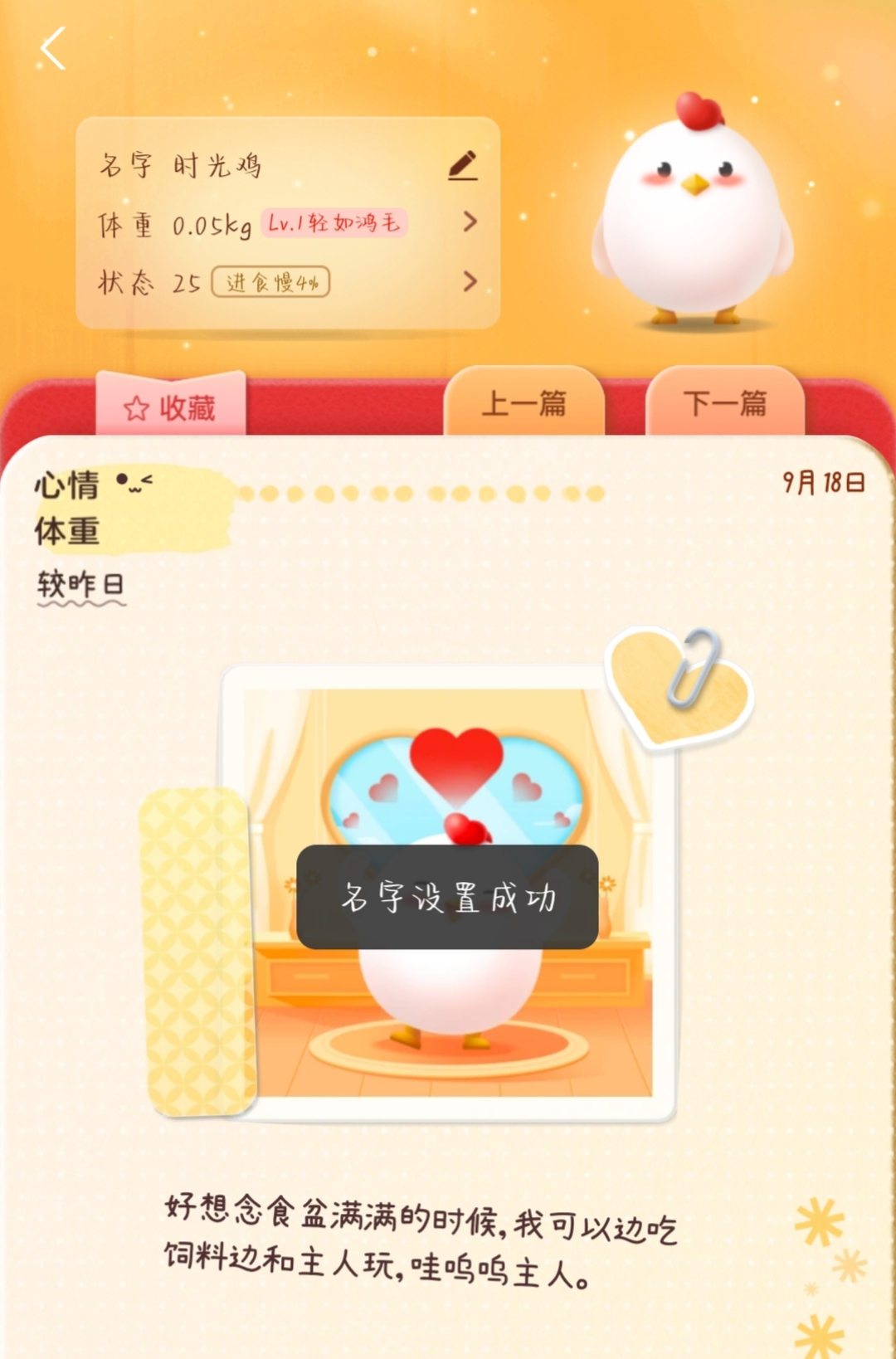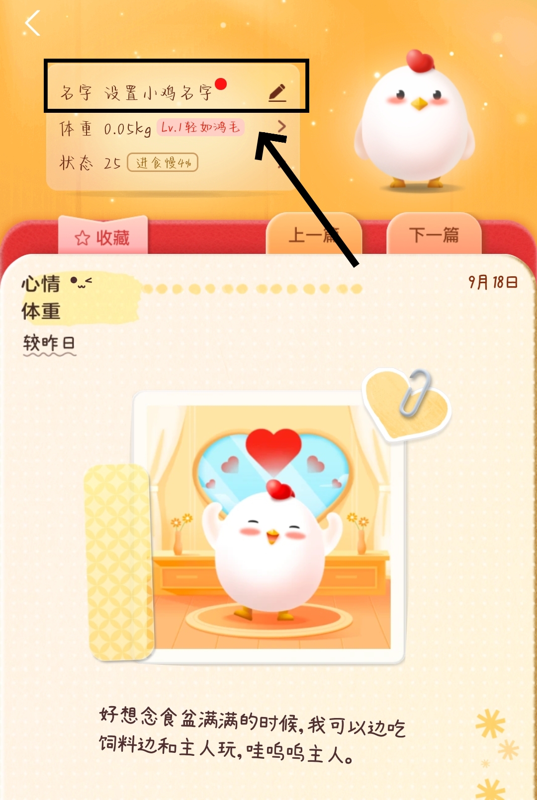 2、在【小鸡日记】里就可以看到【名字】了,我们点击【设置小鸡名字】。