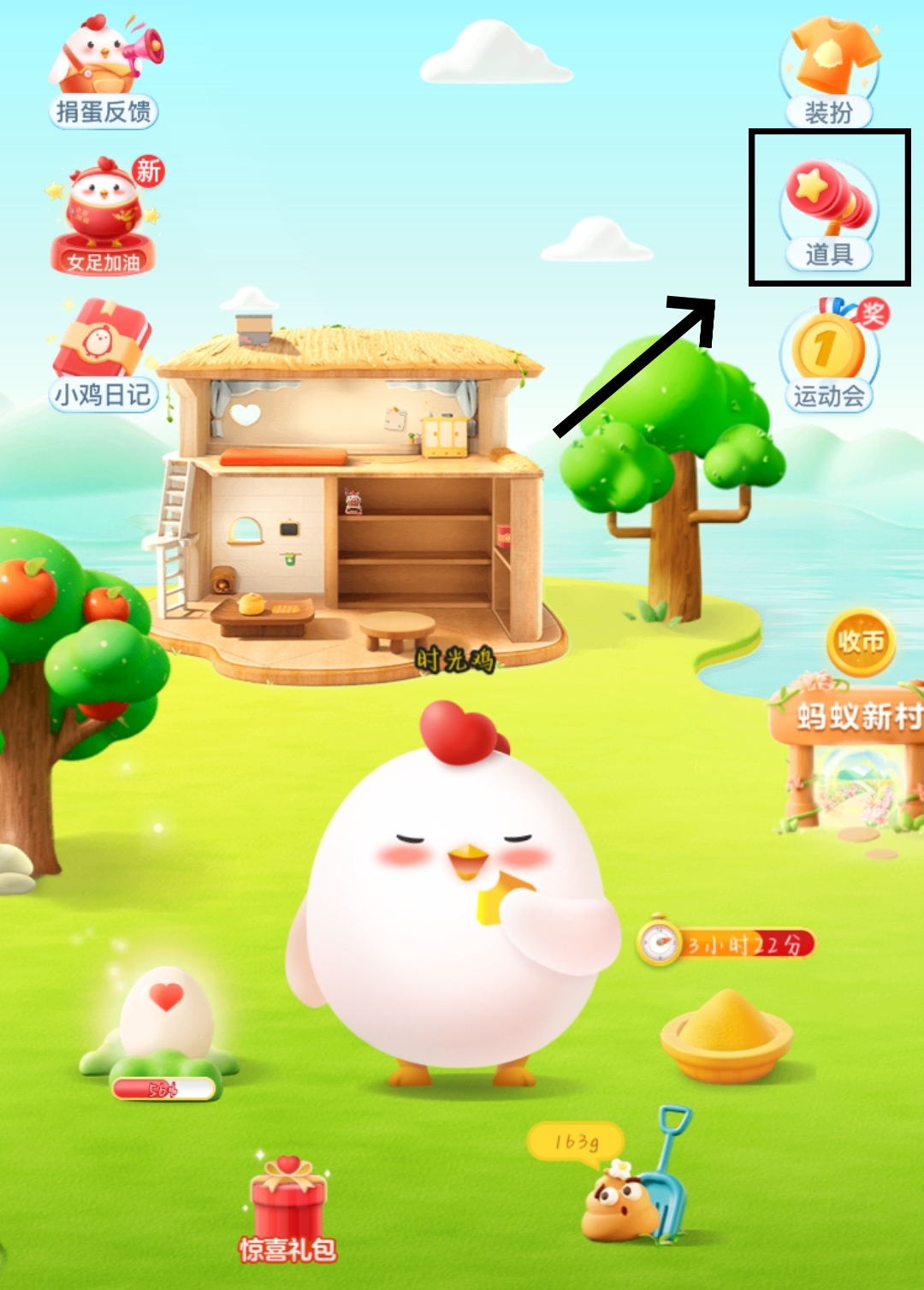1、首先我们来到蚂蚁庄园的首页,点击右边的【道具】。