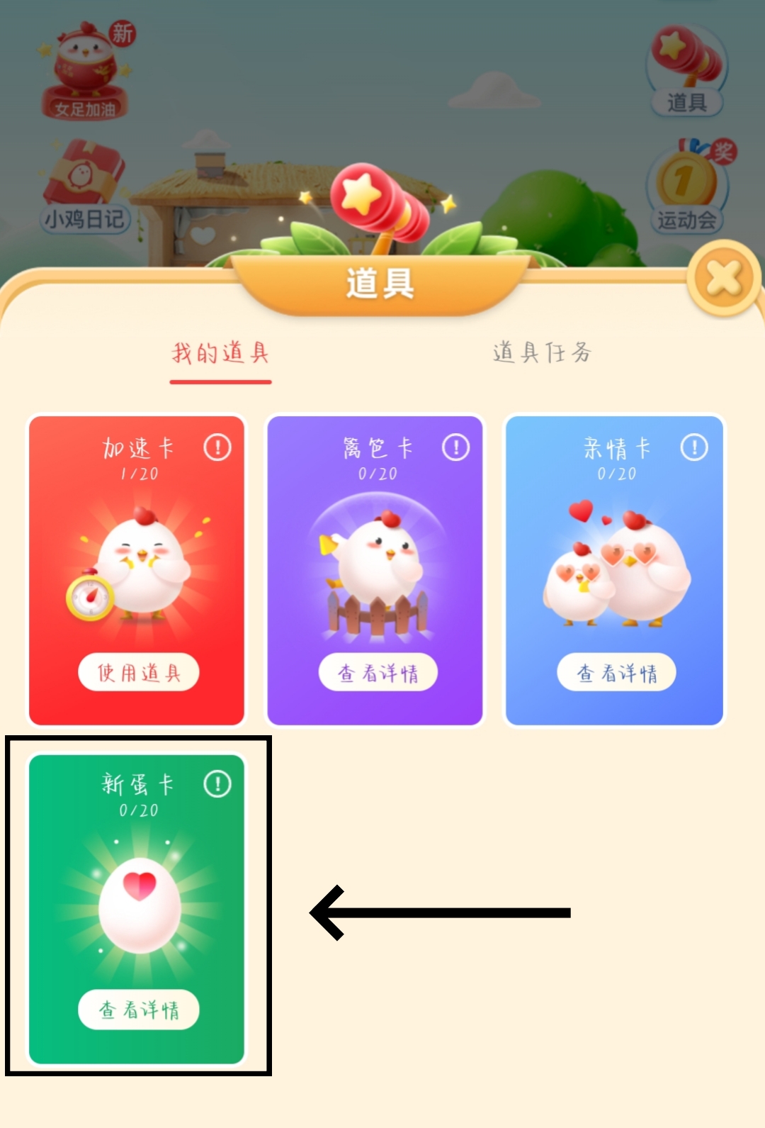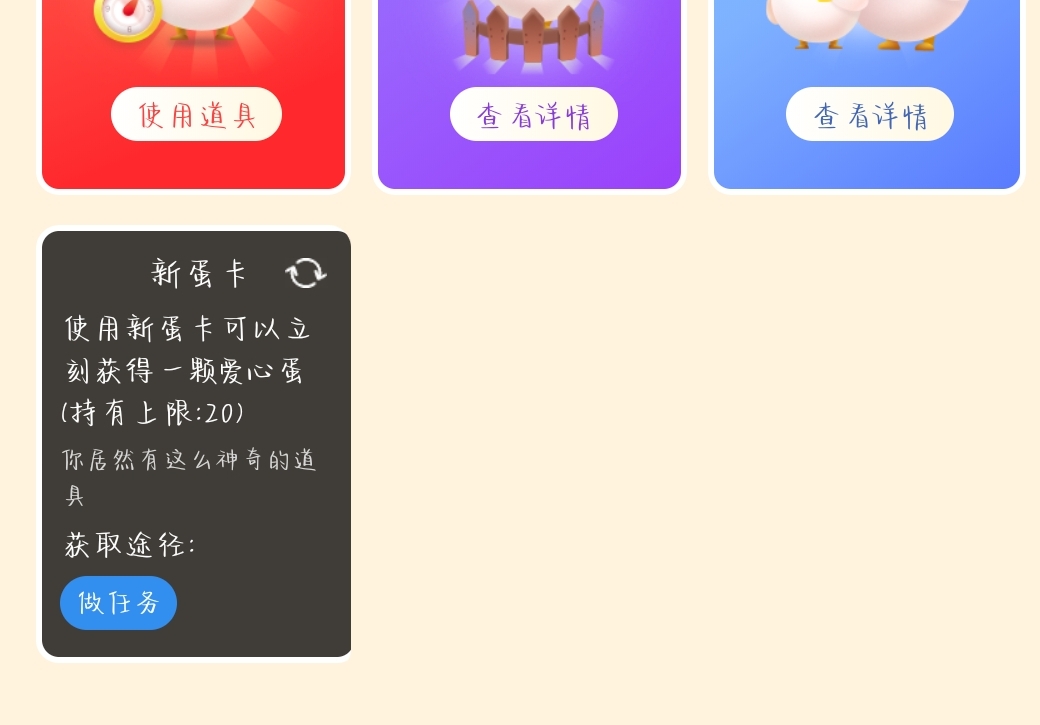 3、【新蛋卡】就是立即获得一枚新蛋的道具喔,不过【新蛋卡】需要通过做任务获得,大家想要快速得蛋就多获取几张【新蛋卡】吧。