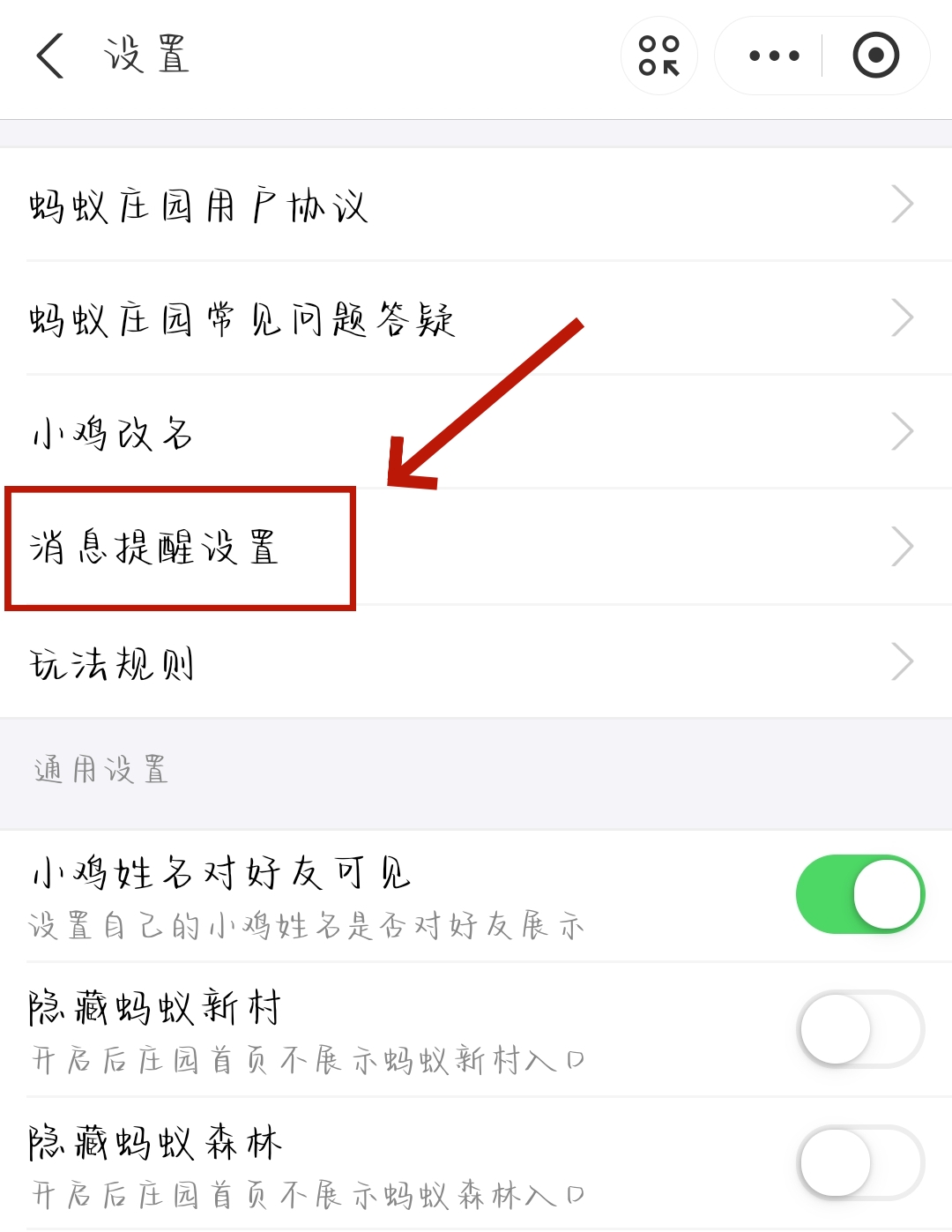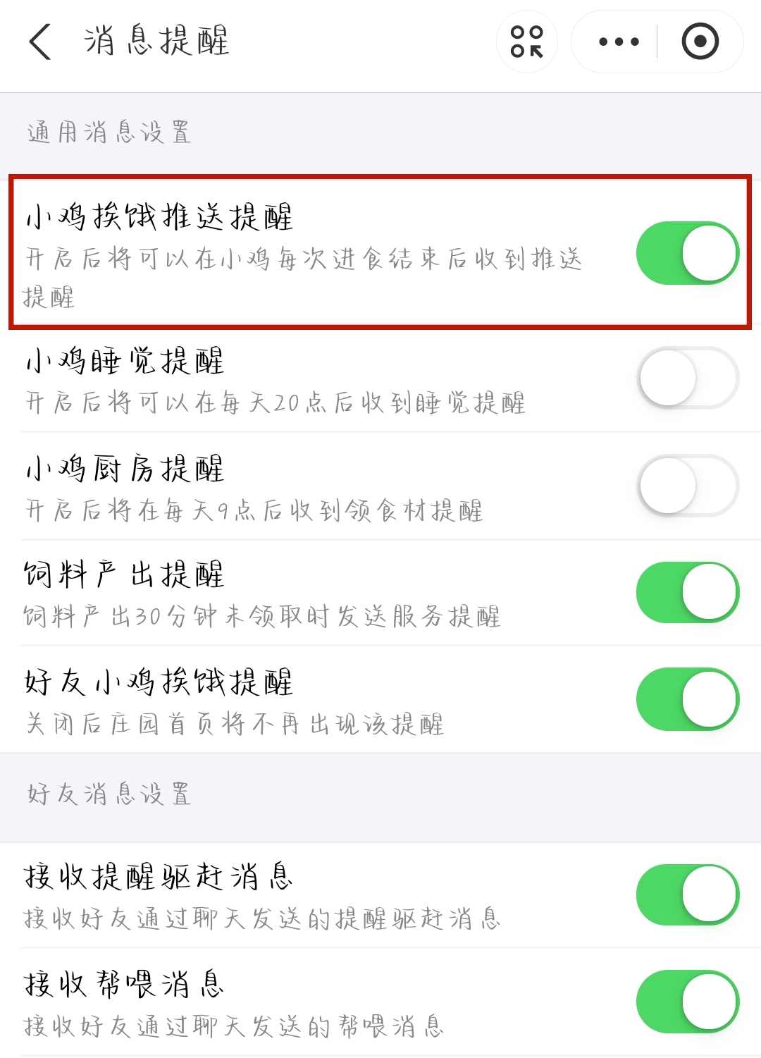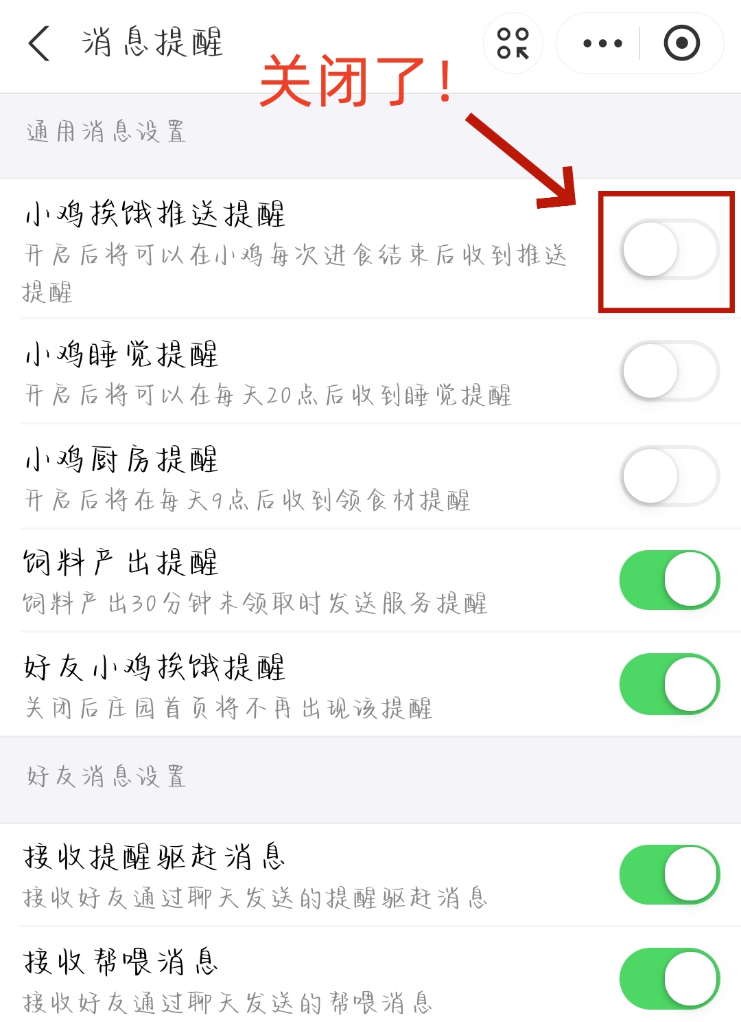 4、进入【消息提醒】我们就能看到【小鸡挨饿推送提醒】了,直接点击开关就可以关闭啦。
