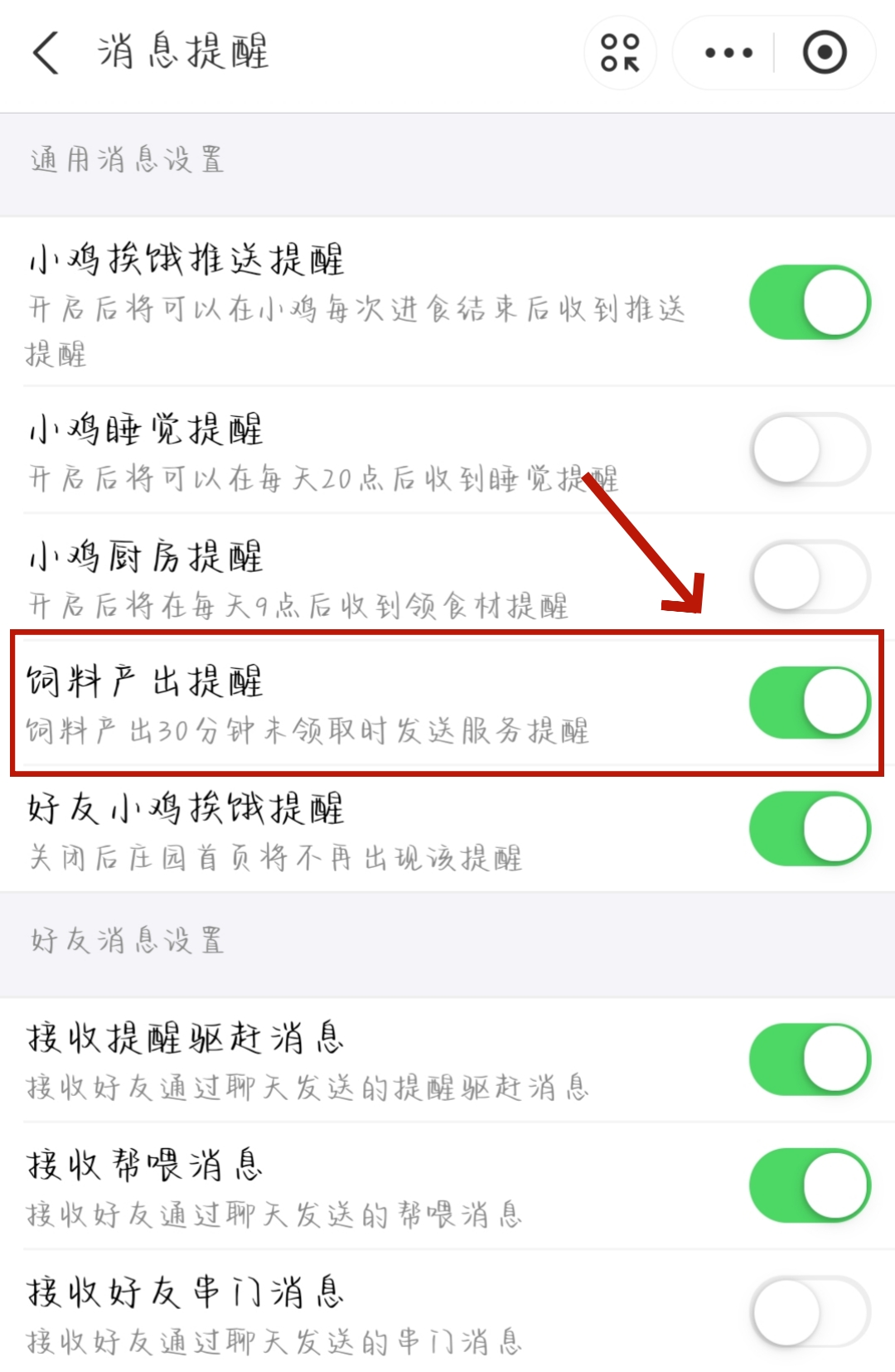 4、在【消息提醒】页面中,我们就可以看到【饲料产出提醒】了,直接将右边的开关关掉就行了。