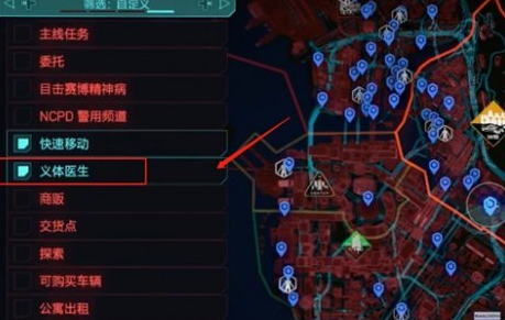 1、我们开启地图左边筛选勾上义体医生,这样就能迅速找到地图上所有义体医生。
