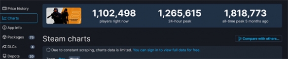 今日,《反恐精英2(CS2)》正式推出,玩家评价为特别好评。根据SteamDB显示,《CS2》当前在线人数1102498,24小时峰值人数1265615。