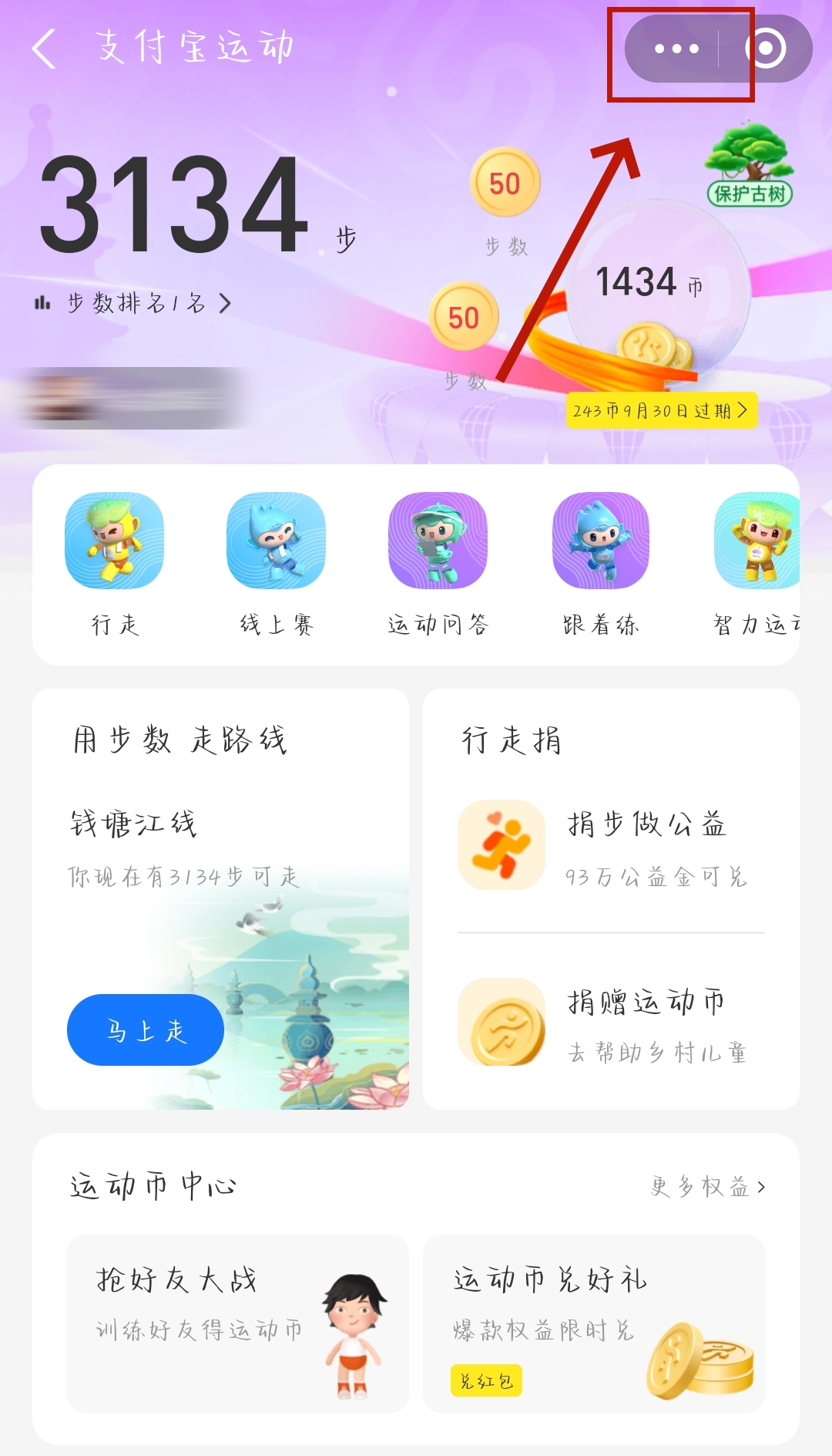 1、我们来到支付宝运动的首页,点击右上角的【···】。