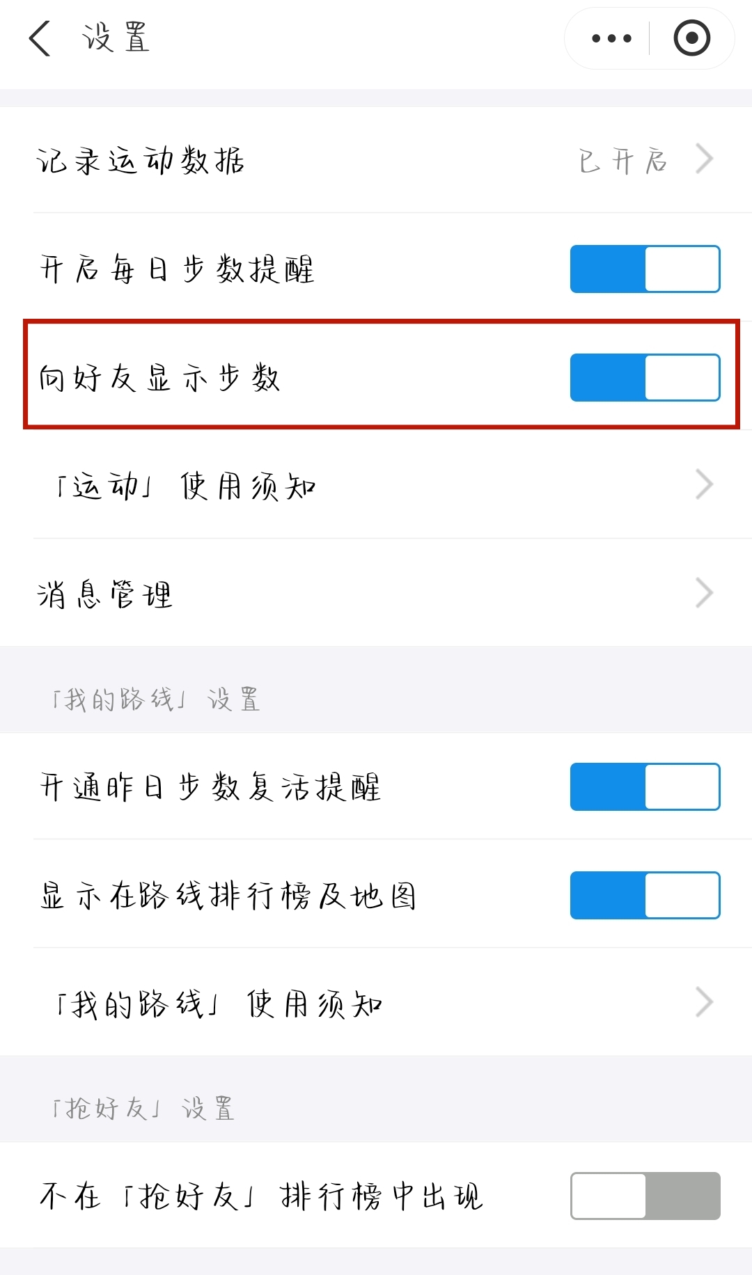 3、进入【设置】页面后,我们直接点击【向好友显示步数】的开关就好友就看不到了。