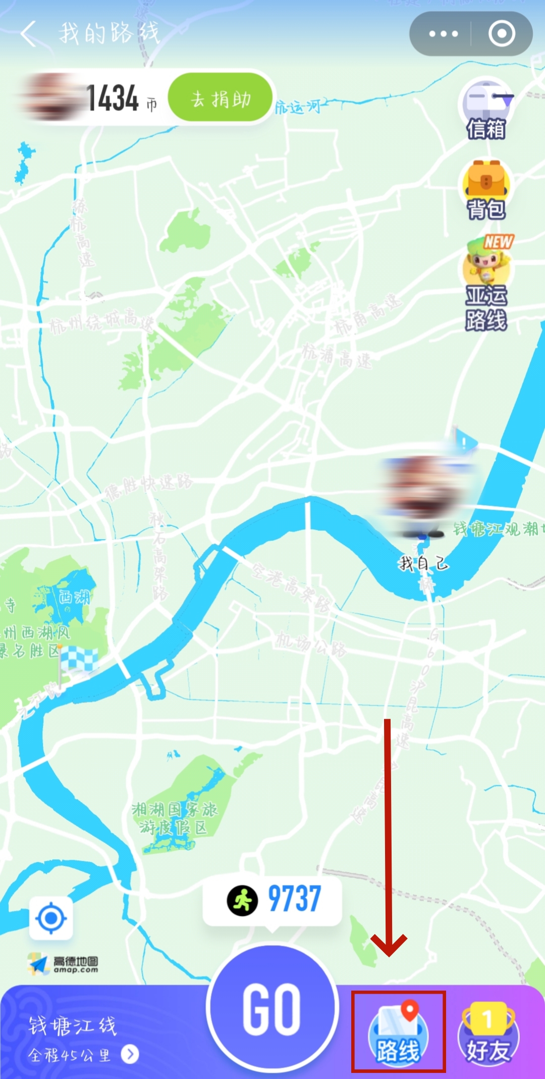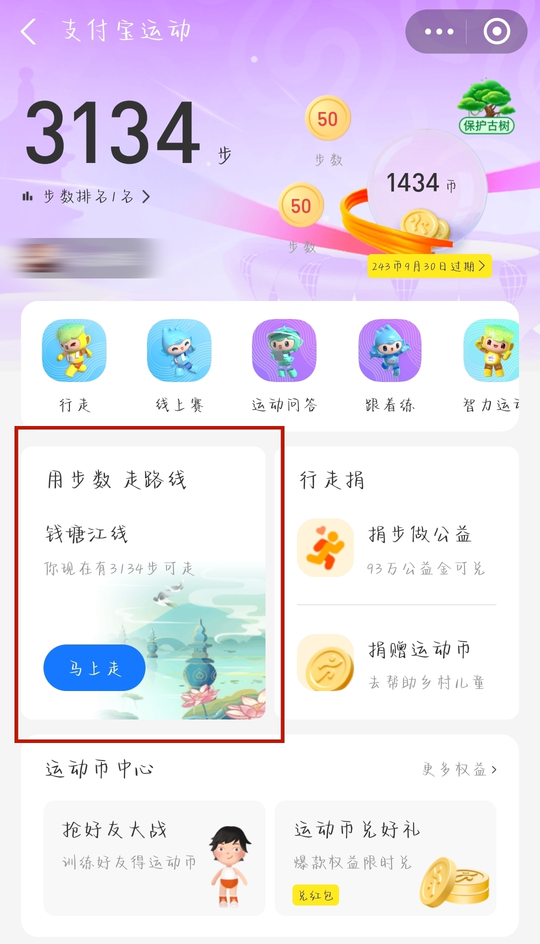 1、我们来到支付宝运动的首页,点击首页的【用步数 走路线】。