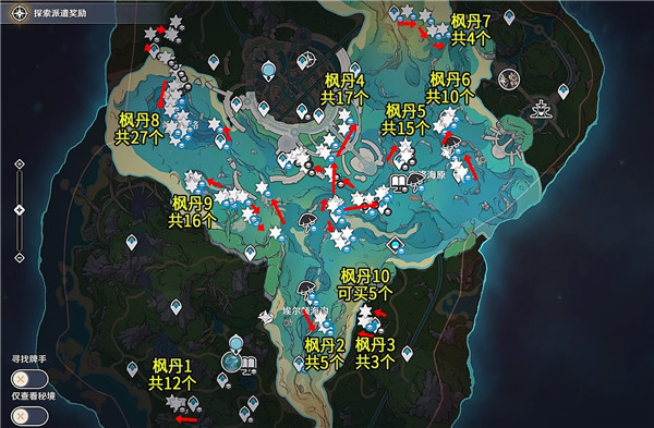 2、苍晶螺的采集路线如下图所示,旅行者们赶紧为夏洛蒂收集更多的苍晶螺吧。