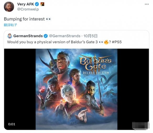 最近有网友在社交媒体上询问:“你会愿意购买《博德之门3》的实体版本吗?#PS5”,该内容受到了拉瑞安工作室发行总监@Cromwelp的关注,并且他回复说他对此也很感兴趣。看起来他们也在考虑实体版的事情。