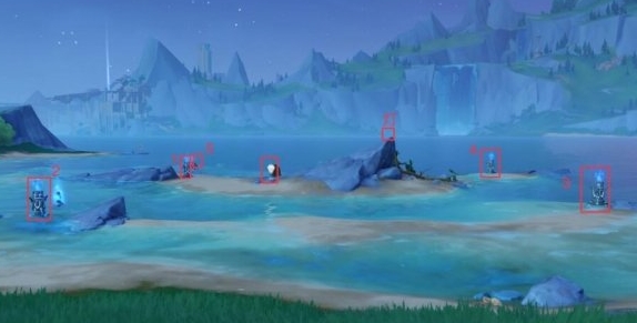 5、我们到1号水元素方碑的旁边再次移动一次瓶子,瓶子现在走向2号水元素方碑并将2号方碑的水吸收掉,我们再用弓箭角色射击一次位于山尖的灯。