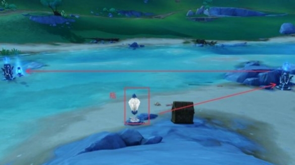 6、这样其他的水元素方碑都被解锁并点亮,瓶子带水也会点亮2号水元素方碑,位于山尖的灯会自动移动到瓶子最初的位置,我们过去就可以开启宝箱了。