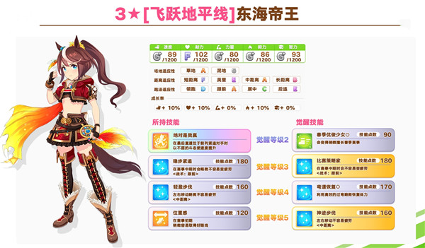 以下就是飞跃地平线东海帝王的基本属性啦,总体来说帝王的换装比本体还是更强的,想要抽取的训练员可以多看看基本属性喔。