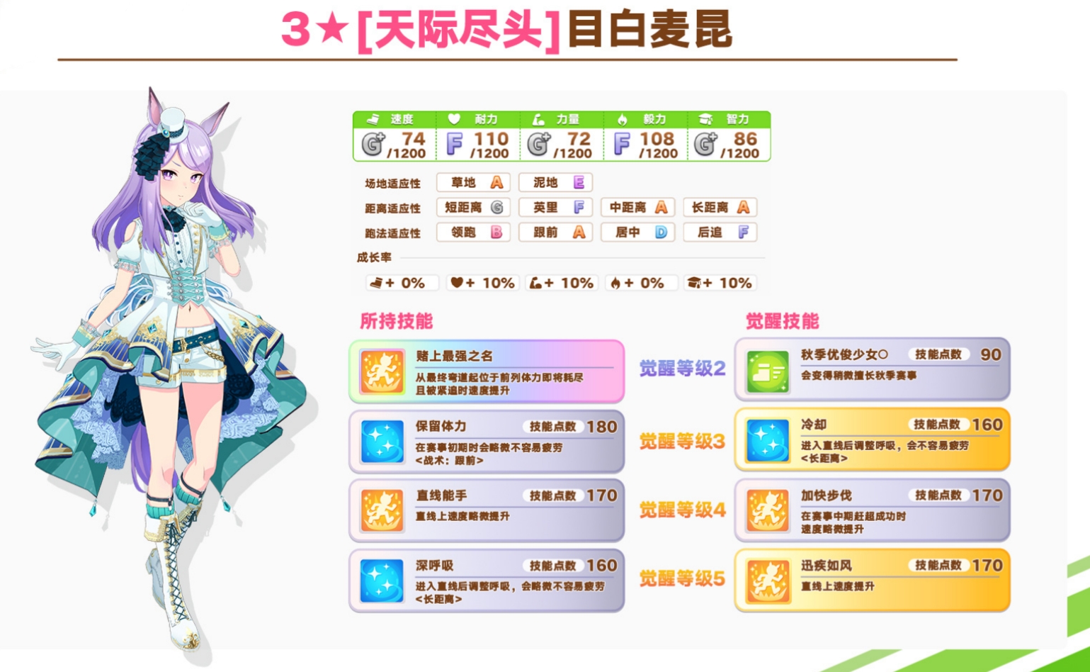 相对原版的麦昆,天际尽头的固有技能一般,各位训练员可以多参考属性进行抽取。