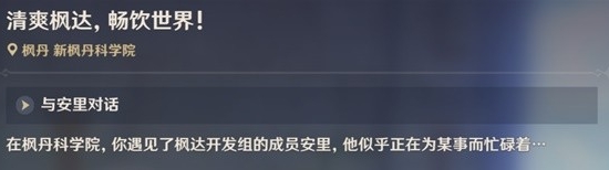 1、首先我们来到枫丹科学院,找到NPC安里并和他对话,帮助他取回研究资料来研发3种新型的枫达饮料。