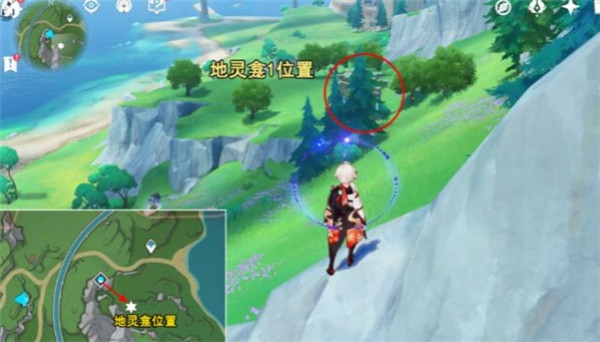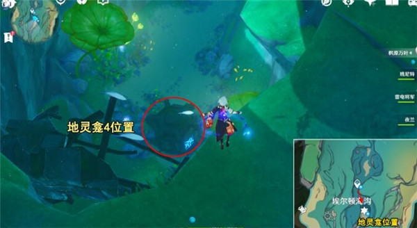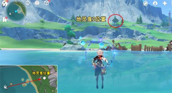 我们先来到枫丹廷右上的水下锚点,一直向东北方向游,地灵龛2号在水岸的山坡上,我们游泳游出来就可以看到了。
