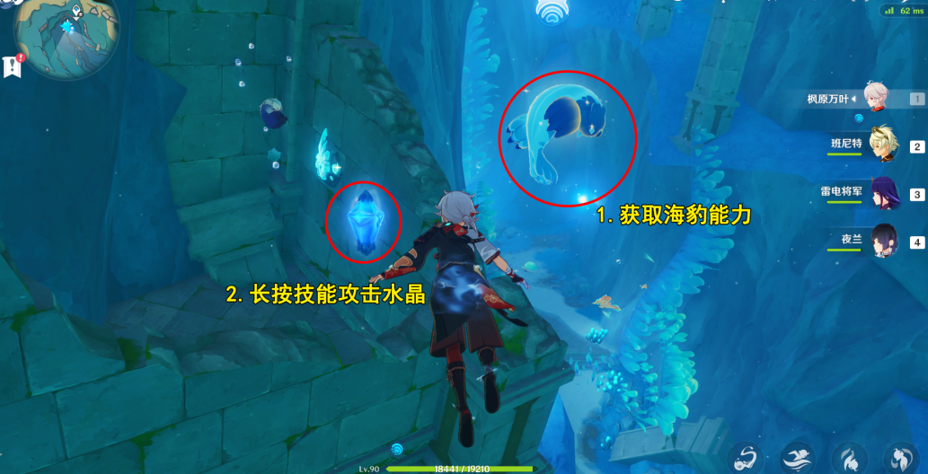 1、举例位置1,我们,从位置1的锚点上游就能找到要救的海獭,大家先获得海豹的能力,再去攻击水晶把海獭救出来。