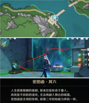 我们从神像出发,直接下楼就可以找到启动机器,这个机器启动后会让我们进入摄像头中,大家按照图中的指示就可以解谜查看密图函了。
