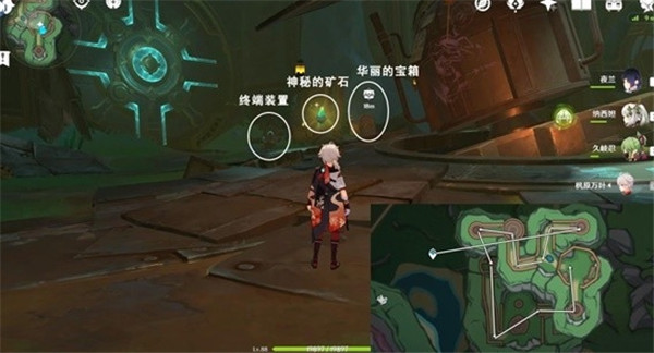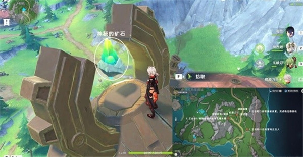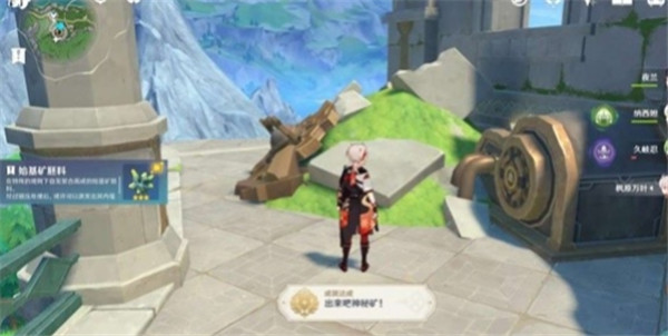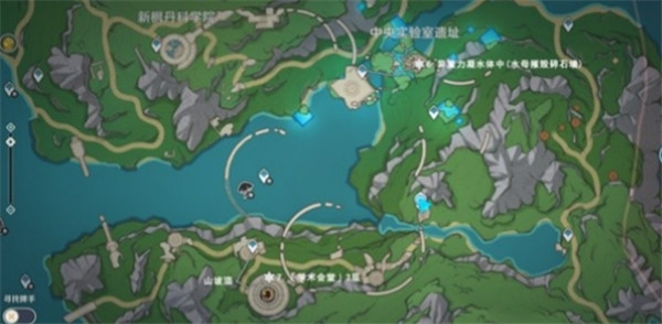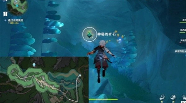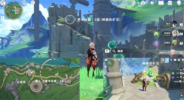 先传送到枫丹科学院的学术会堂,朝地图西南方走,一直走到山坡的顶上,根据图中路线走就可以拿到神秘的矿石了。