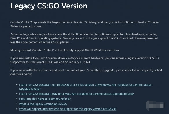而如果你当前的硬件无法运行《CS2》,你也可以选择“遗产版”的《CS:GO》(老版本的《CS:GO》),该版本拥有除官方匹配之外的所有功能。但对于遗产版游戏的支持将于2024年1月1日结束。