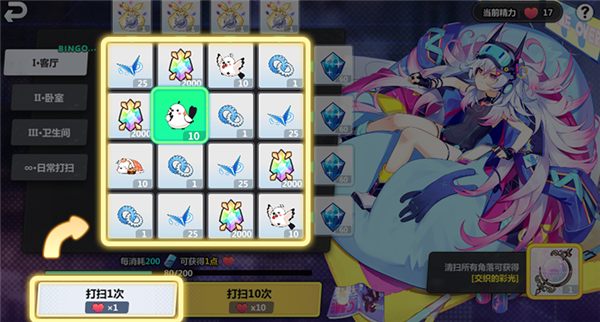 活动玩法:玩家每消耗【200体力】就能获得一点【精力】,【精力】将用于随机打扫房间里的任意一个角落,打扫完就可以获得相应的奖励;