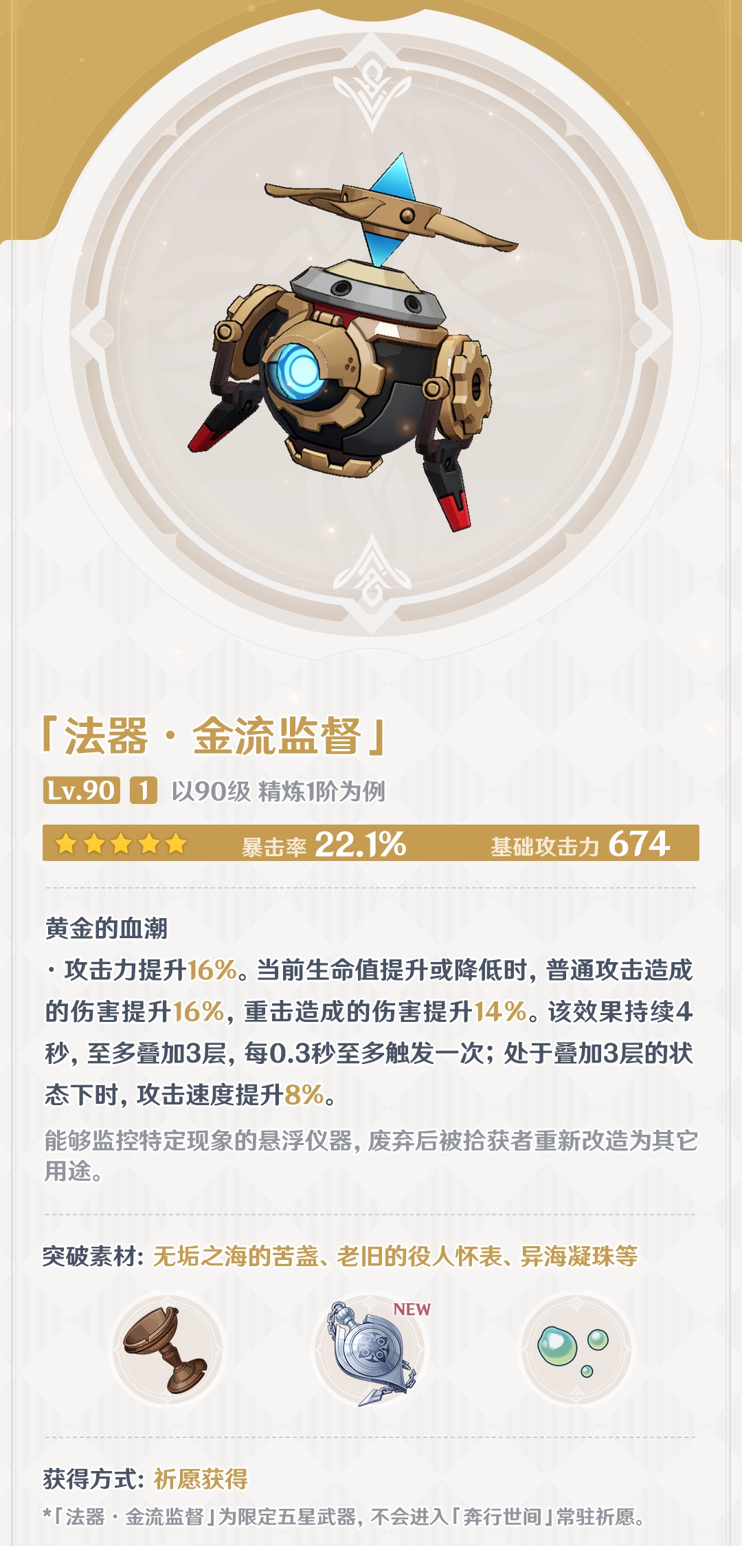 莱欧斯利的专武【金流监督】,主属性为【暴击率:22.1%】,【基础攻击力:674】。