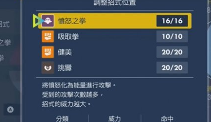 3、弃世猴的配招选择愤怒之拳吸取拳主攻,健美用来强化、挑衅打功能性、道具搭配剩饭,特性选择干劲。