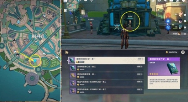 3、我们来到枫丹廷的书店,这里可以买到《雷穆利亚衰亡史·第一、三卷》、《枫丹动物寓言·第一卷》、《怪盗与名侦探:虹彩胸针之谜·第二、三卷》。