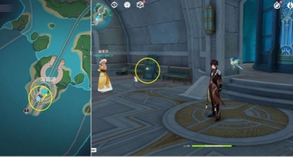 5、我们来到【海露港】的神像,右边的书架上就藏着《枫丹动物寓言·第三卷》。