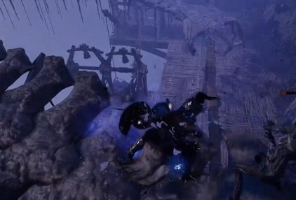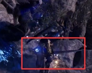3、在缝隙下面有一个闪着蓝光的npc,我们把这个光点打掉。缝隙下方有个上个蓝光的NPC,将闪光点打落。