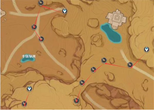 丰饶绿洲这边的圣金虫位置比较分散,分别从3个传送点出发可以找到12只。