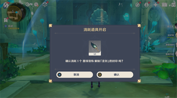 8、第二圈的过程中,我们使用羽毛道具解开圣剑的封印。