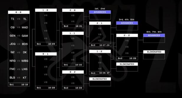 参与比赛的16支队伍会按照比分分为两组,1-0战绩的一组(8队),另外一组(8队)时0-1的比分。