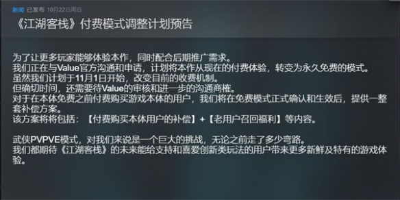 由『风林火山』工作室开发的国产武侠风游戏《江湖客栈(The Jianghu)》近日宣布:从11月1日开始,为了让更多玩家能够体验本作,官方正在计划将现在的付费体验转变为永久免费的模式。而在此之前购买了本作的玩家,也将会提供一套补偿方案。