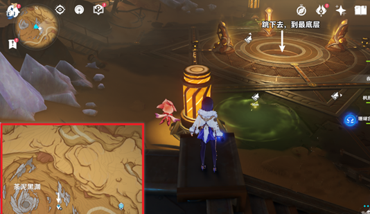 1、我们来到荼泥黑渊地下的传送点,然后跳到电梯的最底层。