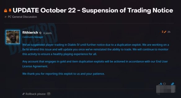 有鉴于这个现象开始普遍流传,暴雪娱乐通过官方讨论区公告表明再次封锁玩家交易系统,并警告滥用 Bug 已违反使用者授权协议。