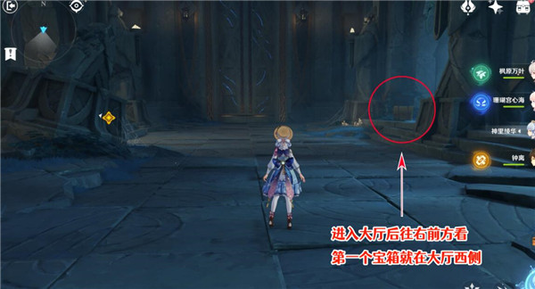 继续朝大厅走,宝箱1就在大厅的右侧,我们直接开启即可。