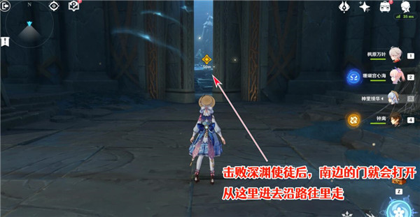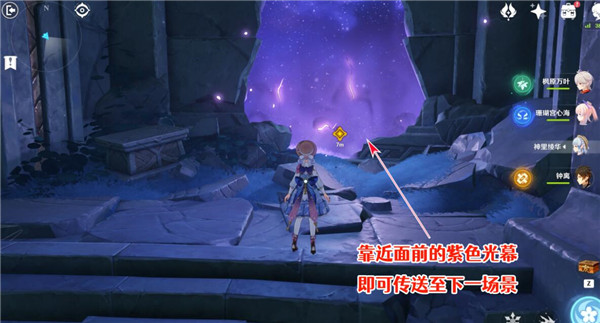 拿完宝箱1后,我们根据任务指引进入紫色的光幕,一直走到下一个场景。