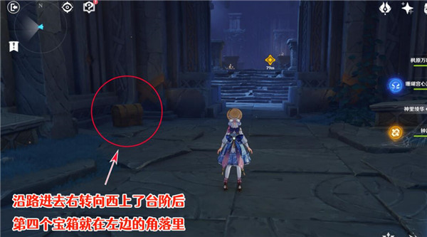 沿路进去右转,上西边的台阶就可以找到宝箱4了,拿完宝箱4我们继续向前走过剧情即可。