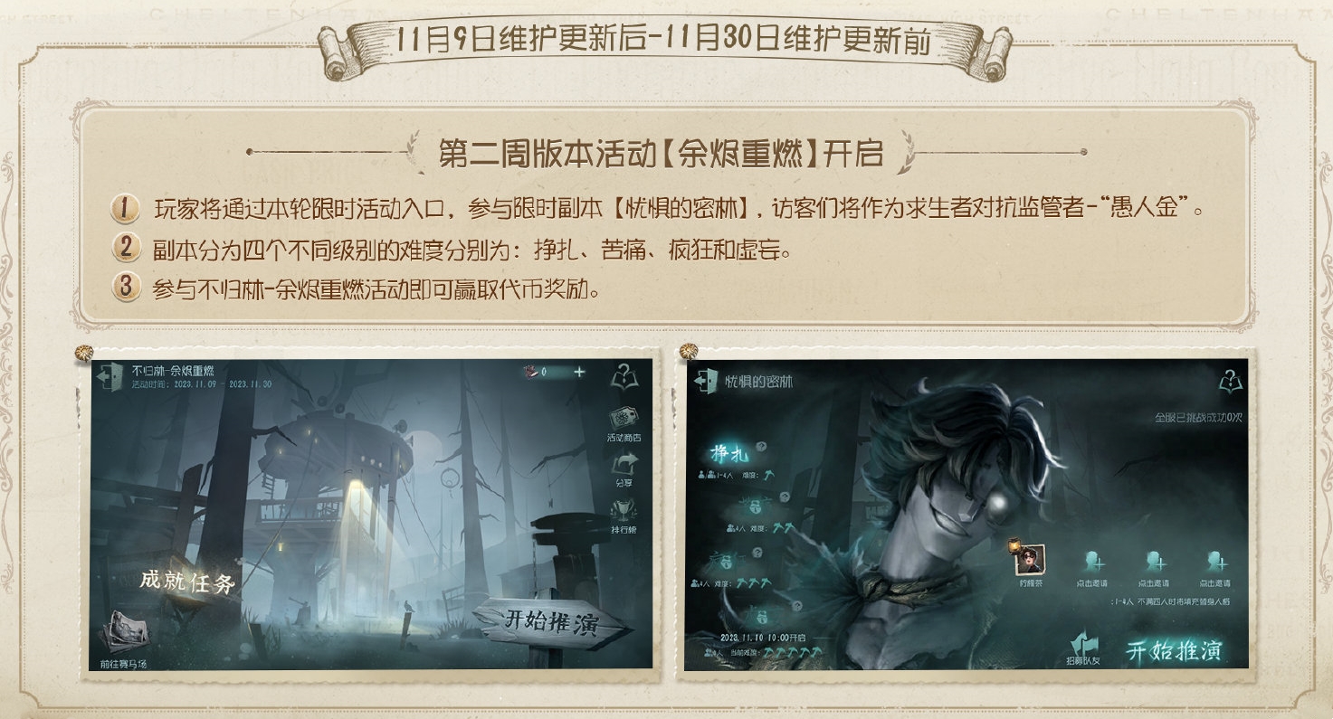 第五人格第三十赛季版本活动非常丰富噢,第三十赛季将要上线全新的战斗地图,版本活动商店也会有非常丰厚的奖励,各位庄园访客也都很想看看第三十赛季版本活动的玩法和活动奖励了,小编这篇文章就带大家看看版本活动白驹遗恨和余烬重燃的玩法吧。