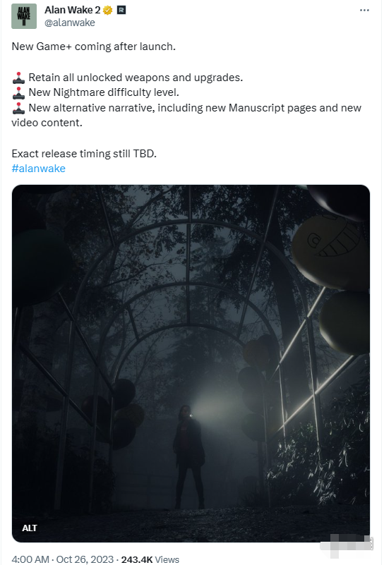 《心灵杀手2》即将在10月27日发售,官推今日宣布《心灵杀手2》在发售时有三种难度模式可供选择,新游戏+模式将在游戏发售之后更新(具体日期暂未确定)。