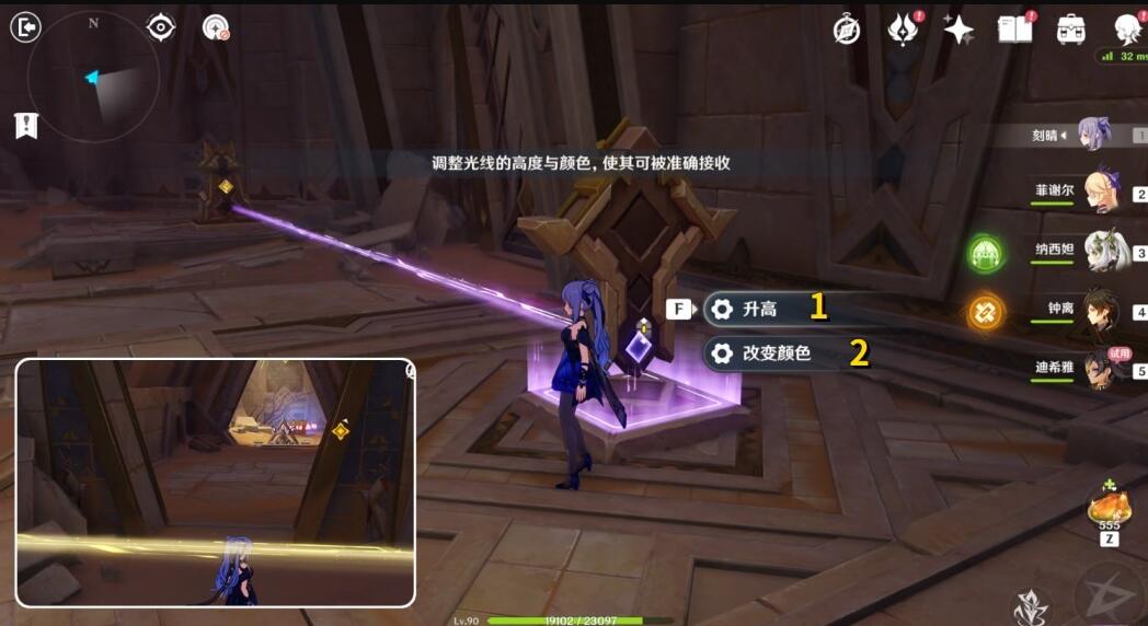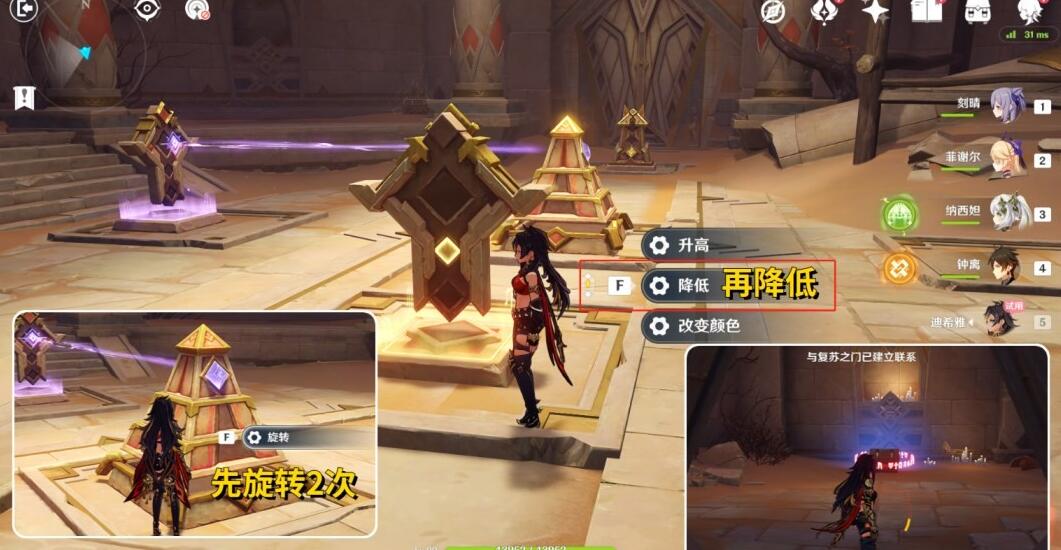 5、继续向前,这里先把中间的机关【旋转2次】,再把黄色光线的机关【降低】,大门打开后同样把怪打完解锁【宝箱2】。